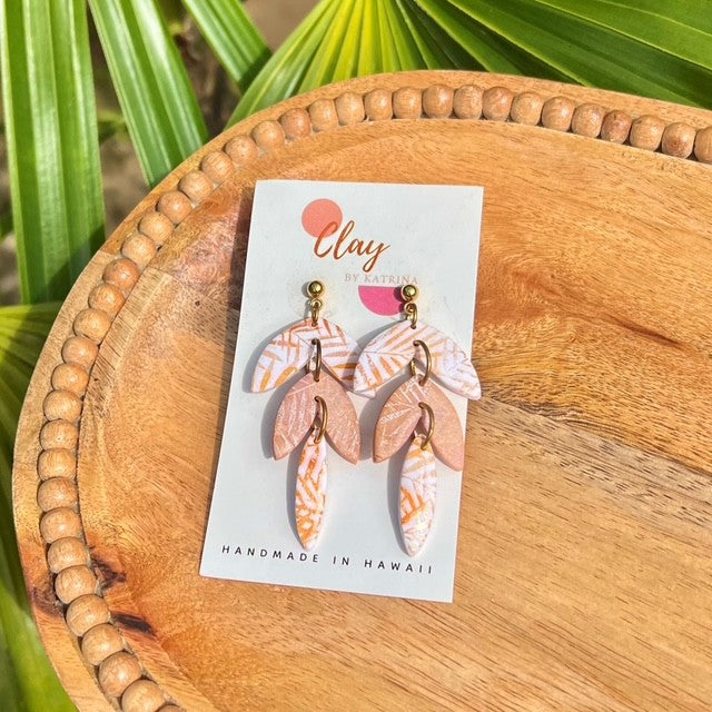 Polymer Clay earrings, using a silk screen and acrylic paint for a simple leafy print.