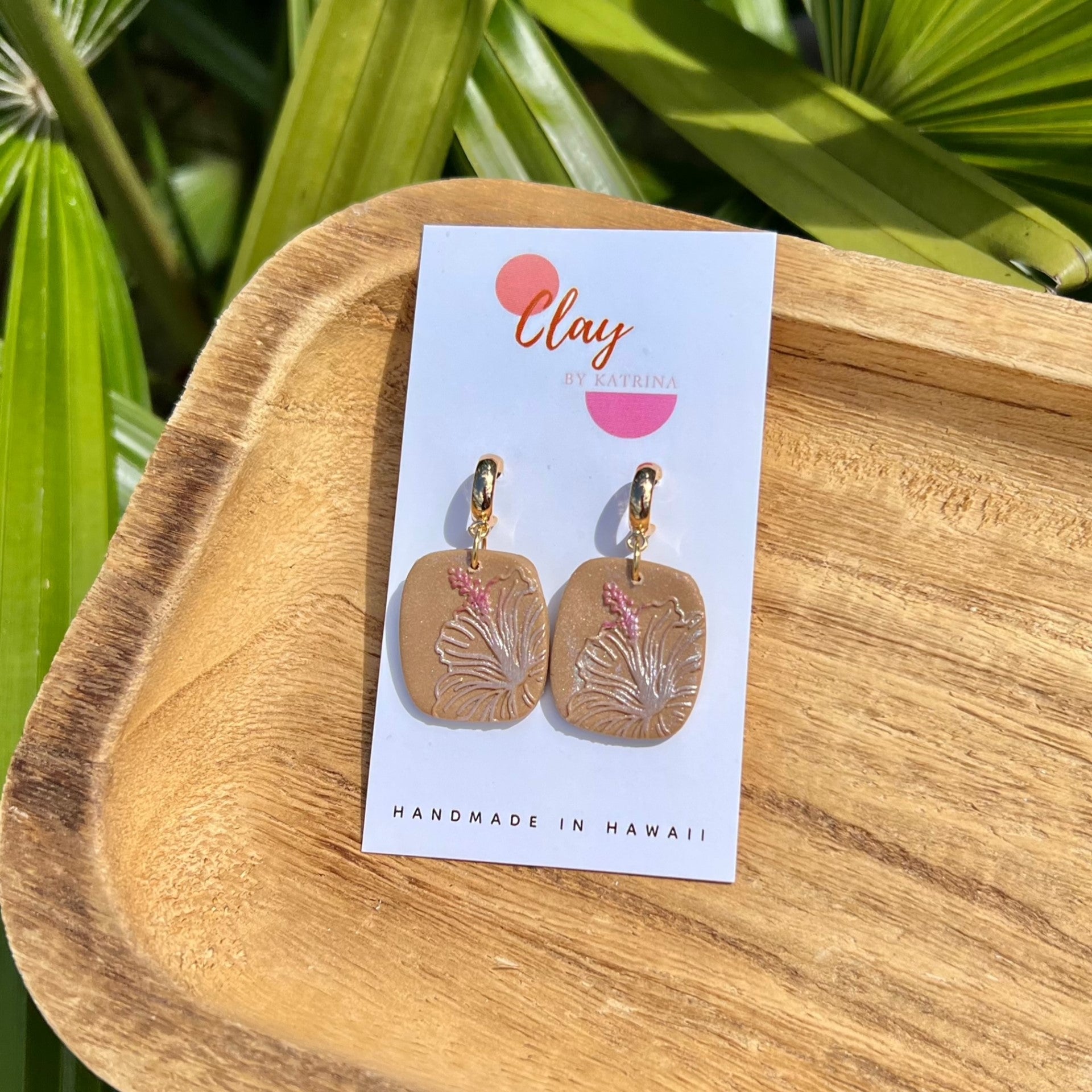 Polymer Clay earrings, using a hibiscus textured mat and mica powder.