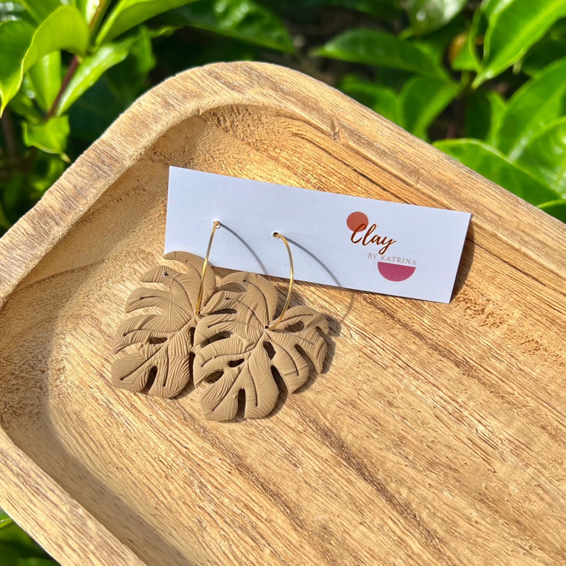 Monsterra Polymer Clay earrings, using a leaf textured mat.